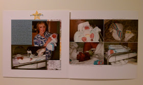 And here are some more baby book pages of Garrett. We're almost done, here, so bear with me! Lol! Again, there is not much in the way of embellishments. I really am just looking to get these DONE! (I do wish I could have used Studio J's photo editing feature to erase that hospital gown, though..) You can click on the pictures to see a large version or to read any journalling.